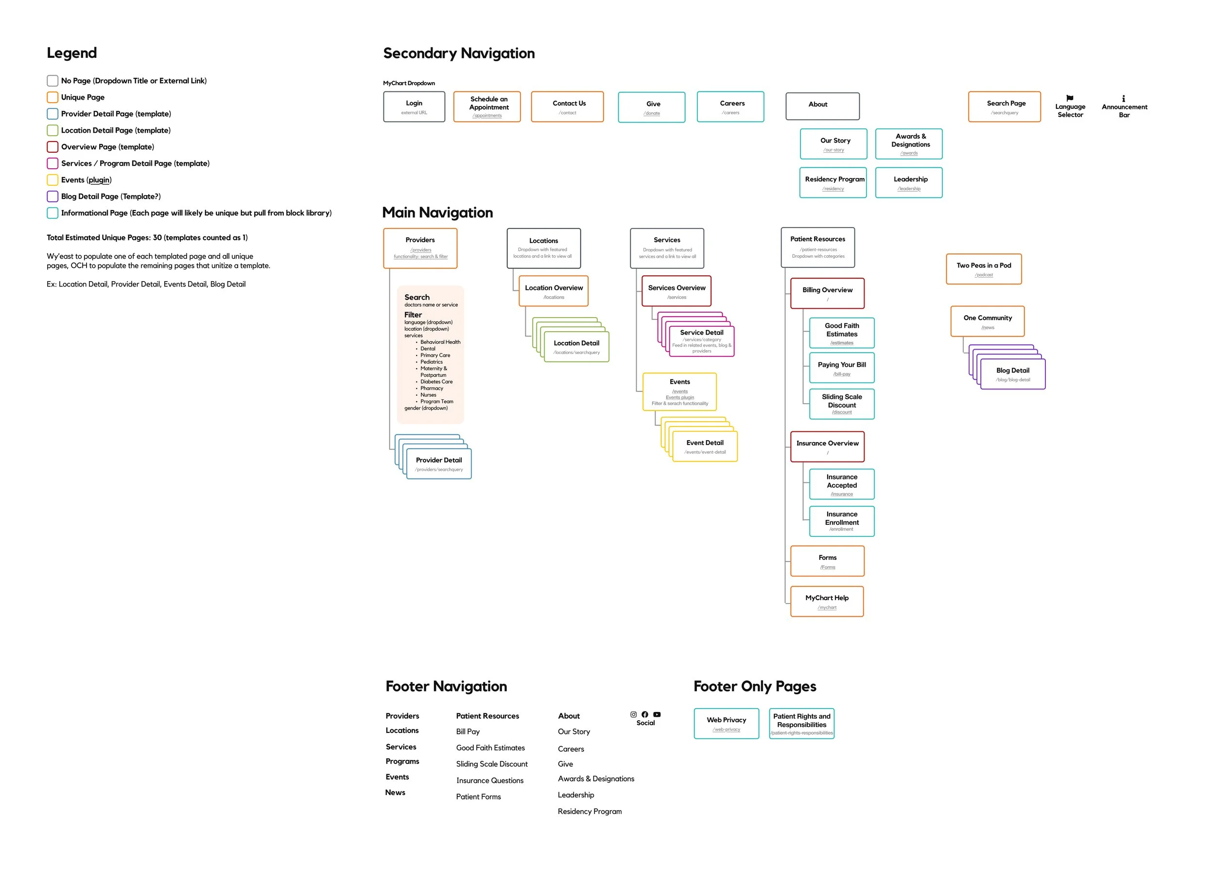 In parallel with the sitemap, we refined the categories and subcategories used to help patients find providers, services, blog content, and events. For example, services were grouped into two primary buckets: healthcare-focused services and community programs offered by OCH. This approach created a cleaner, more concise structure. These service categories were then used consistently across the site to organize blog content and define provider and team types, resulting in a more cohesive and user-friendly experience.