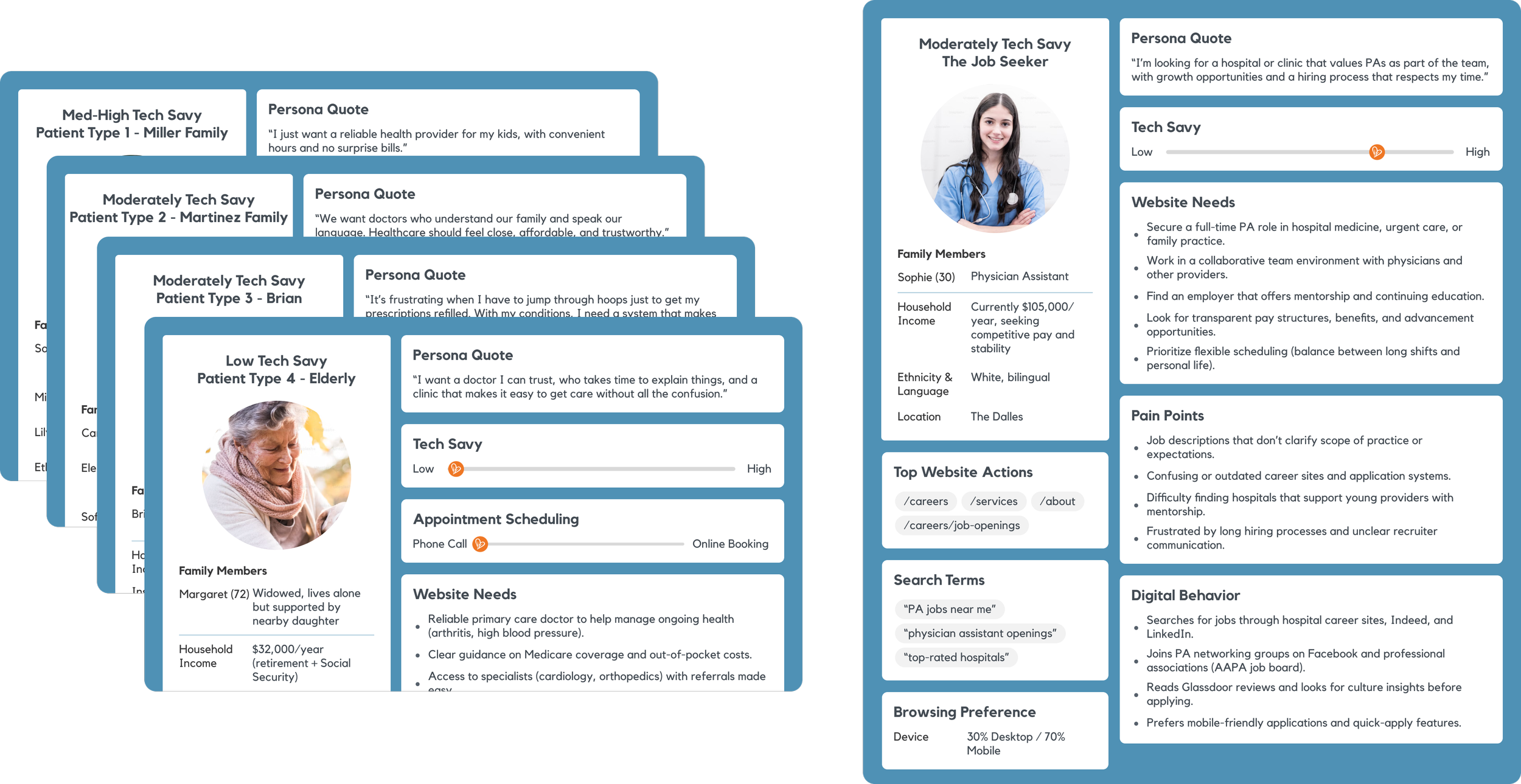 Knowing who you are designing for—and what they come to the website to accomplish—is essential. Without clearly defined primary and secondary audiences, design decisions are made blindly. Given OCH’s wide range of offerings, it was especially important to understand their audiences so we could prioritize what mattered most in key user flows. Drawing from research, stakeholder feedback, and past analytics, we identified both primary and secondary audiences and developed problem statements that guided the design process from start to finish.